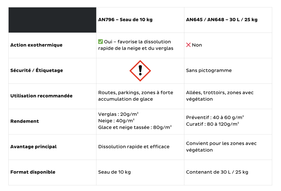Produit formulé pour une grande efficacité dans des conditions hivernales extrêmes. Il se dissout en dégageant de la chaleur, accélérant ainsi la fonte de la neige et de la glace.